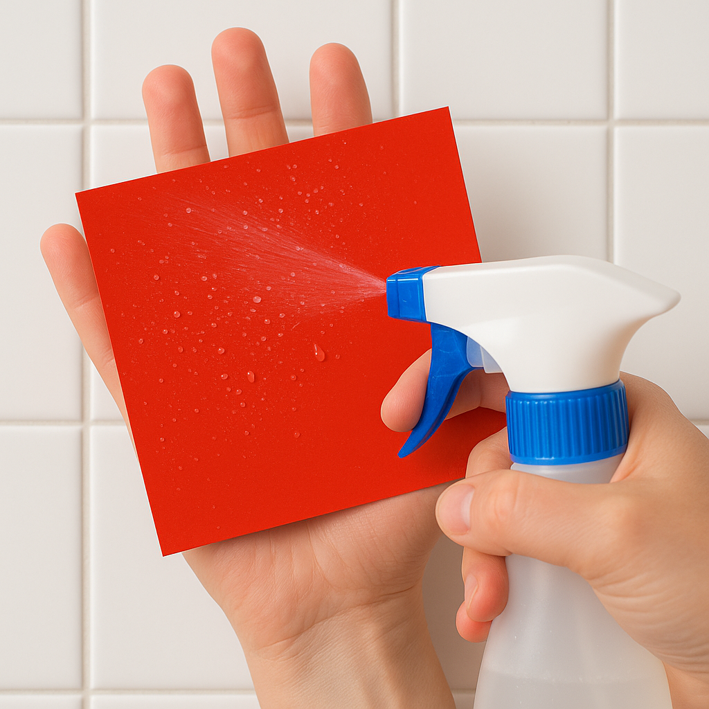 Entfernen Sie vorsichtig die Trägerfolie und besprühen Sie sowohl den Fliesenaufkleber als auch die Fliese mit einer WasserSpülmittellösung. Dabei reichen 1–2 Tropfen Spülmittel auf einen Liter Wasser völlig aus.